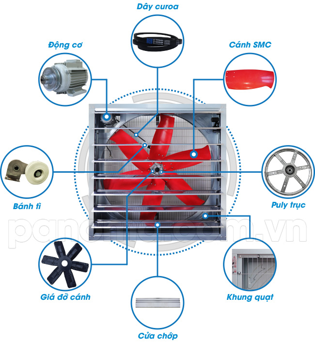 Dưới đây, chúng tôi sẽ mô tả cụ thể các bộ phận của Quạt thông gió vuông hiệu suất cao.